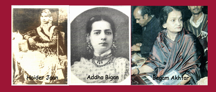 Ustad Sadiq Ali Khan was the father of the Lucknow Thumri. Stalwarts like Moizuddeen Khan, Bhaiya Saheb Ganpat Rao and Bindadeen Maharaj graced the Nawab’s court. Thumri and Kathak had an exalted status, and the Nawab himself was a writer/composer of several Thumris. The Lucknow Thumris were mainly of “bol- baant” in nature and called “Bandish ki Thumri”. This style of Thumri follows a faster taal cycle, usually the ‘teentaal” or the ‘ektaal” and was more suited to Kathak dance. Thus, Bindadeen Maharaj went on to become a famous writer/composer of this style of Thumris as he employed them for the abhinay or emotive aspects of his Kathak. Begam Akhtar was a famous exponent of Ghazal as well as Thumri. Her style of Thumri is influenced by the Lucknow/Punjab styles. Kumud Diwan sings in the Begam Akhtar tradition, as well as the Bandish Thumris of Lucknow. Thus, she spans the entire spectrum of the Poorab-Ang Thumri from Banaras, Gaya and Lucknow.